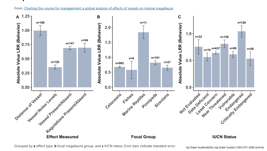 Vessel traffic represents one of the most pervasive and escalating sources of disturbance in marine environments, affecting organisms through noise, physical presence, habitat degradation, collisions, and pollution. For some marine megafauna, including species of cetaceans, sirenians, fishes, pinnipeds, and marine reptiles, many of which are at high risk of extinction, effects of vessels are especially pronounced, well-documented, and recognized as a significant threat. Characterizing the potential effects of interactions between vessels and marine megafauna is necessary for effective science-informed management strategies. However, to-date these effects have not been comprehensively synthesized across species and ecosystems. To fill this gap, we conducted a global meta-analysis on the effects of vessels on marine megafauna, quantifying vessel effects on behavior, physiology, metabolism, and populations. Analysis of 1850 comparisons (‘vessel treatment and control scenarios’) across 204 peer-reviewed publications on 57 different species revealed that vessel effects vary widely across taxa and response types. Our systematic analysis provides a foundation for the development and implementation of multi-pronged management strategies to mitigate vessel-related threats to marine animals and enhance resilience in an era of increasing anthropogenic pressures.