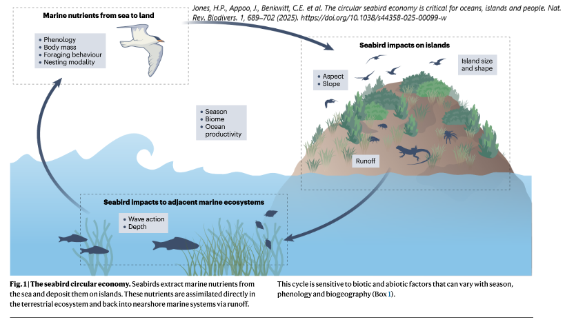 Nearly a third of seabird species are at risk of extinction, rendering them among the most threatened bird taxa globally. The decline in seabird populations has major ramifications for their associated ecosystems. An expansive literature covers seabird impacts on their breeding islands, and growing research expands understanding of the circular seabird economy — cross-ecosystem connections of seabirds from oceans to islands, and back to nearshore marine ecosystems, mainly driven by nutrient transfer. Amid the twin biodiversity and climate crises, maintaining and restoring the circular seabird economy is one way to achieve large-scale, cross-ecosystem impacts with simple and time- tested conservation methods. This Review summarizes researchers’ understanding of the circular seabird economy and outlines goals for future research. Historically, research has focused on terrestrial impacts, with emerging research explicitly studying the cross-ecosystem impacts of seabirds. We identify substantial knowledge gaps, with research needed to understand how the circular seabird economy changes with space, time, across biomes and with island size. Emerging analytic and monitoring tools will helpto propel this research forward. Many coastal communities, especially Indigenous people, rely on seabirds for their livelihoods and cultural connections, and so taking a people-centred approach incorporating Indigenous knowledge and perspectives is critical moving forward.