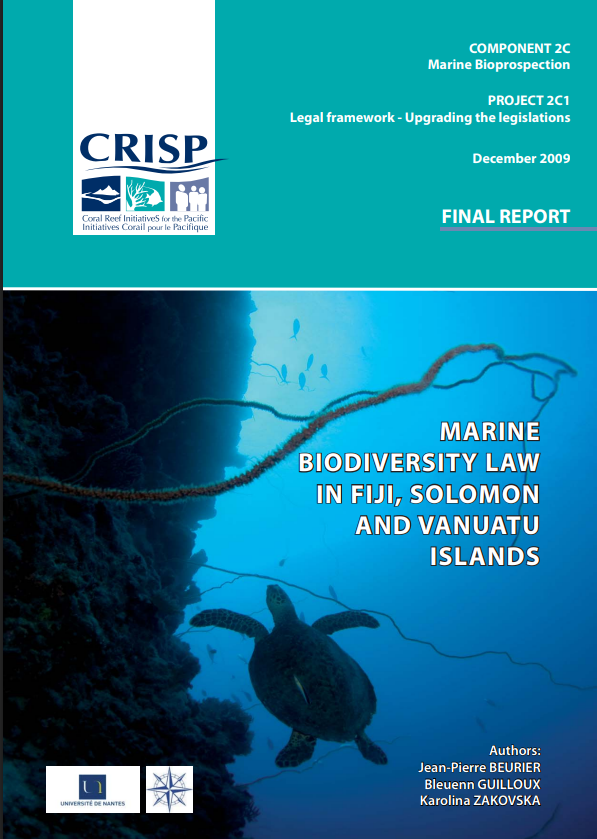 The research agreement signed on 19th December 2005 by the Institute of Research for Development (IRD), the University Paul Sabatier (Toulouse III) and Nantes University, the Pharmacochemical laboratories of Natural Substances and Pharmacophores Redox (UMR 1165) and the Centre of Maritime and Ocean Law (EA 1165, CDMO) led to the international research program Coral Reef Initiatives for the Pacific (CRISP). Within the CRISP program, the research work was incorporated under component 2C: Bioprospection and marine active substances, CDMO being in charge of the section: Legal aspects related to the valorization of marine biodiversity