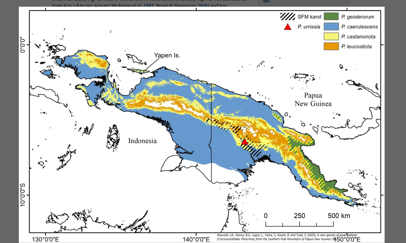 Based on distinctive morphological and vocal characters we describe a new species of jewel-babbler (genus Ptilorrhoa) from the forested karst of the Southern Fold Mountains in Papua New Guinea. The description is based on camera trap data and is presented in accordance with ICZN Declaration 45. The new species is currently known only from the type locality at the top of Iagifu Ridge (1335–1400 m above sea level), a limestone anticline isolated from the main body of New Guinea's central cordillera, where it is uncommon. Given the importance of competitive exclusion in determining Ptilorrhoa distributions, and the near ubiquitous occurrence of congeners, we speculate that Iagifu Ridge may support part of a highly fragmented population that occupies isolated low mountains that do not support Ptilorrhoa leucosticta of higher elevations. Potentially suitable sites may be restricted to the area between Mt Bosavi and Mt Karimui in southern Papua New Guinea.