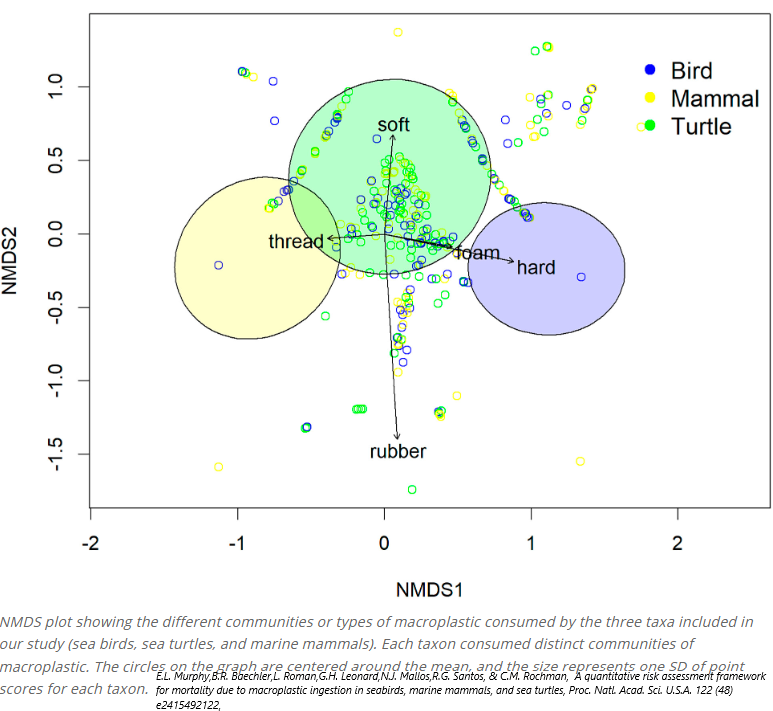 lastic ingestion is a known cause of mortality across taxa, yet the quantitative risk plastic ingestion poses is still poorly understood. Based on data from more than 10,000 necropsies, we estimate the likelihood of mortality due to the gastrointestinal load of various plastic materials—hard, soft, rubber, and fishing debris—for seabirds, marine mammals, and sea turtles. We find that 6 to 405 pieces of ingested macroplastic (or a volume between 0.044 and 39.89 cm3/cm body length) lead to a 90% chance of mortality in these marine species. Importantly, the amount varies depending on plastic types ingested and taxon. Our findings can be used to better understand the mortality risk of macroplastic pollution and inform future risk assessment frameworks.