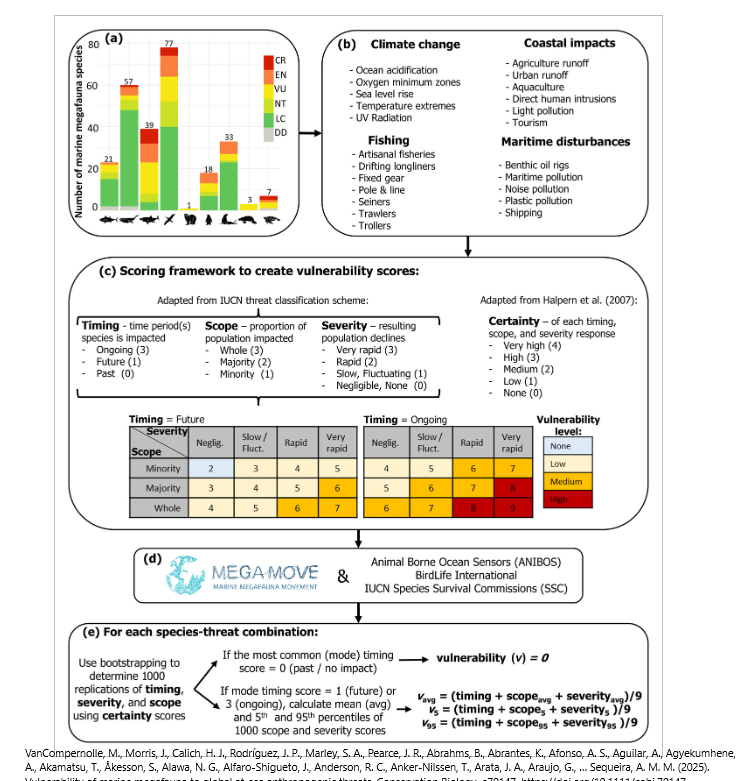 Marine megafauna species are affected by a wide range of anthropogenic threats. To evaluate the risk of such threats, species’ vulnerability to each threat must first be determined. We build on the existing threats classification scheme and ranking system of the International Union for Conservation of Nature (IUCN) Red List of Threatened Species by assessing the vulnerability of 256 marine megafauna species to 23 at-sea threats. The threats we considered included individual fishing gear types, climate-change-related subthreats not previously assessed, and threats associated with coastal impacts and maritime disturbances. Our ratings resulted in 70 species having high vulnerability (v > 0.778 out of 1) to at least 1 threat, primarily drifting longlines, temperature extremes, or fixed gear. These 3 threats were also considered to have the most severe effects (i.e., steepest population declines). Overall, temperature extremes and plastics and other solid waste were rated as affecting the largest proportion of populations. Penguins, pinnipeds, and polar bears had the highest vulnerability to temperature extremes. Bony fishes had the highest vulnerability to drifting longlines and plastics and other solid waste; pelagic cetaceans to 4 maritime disturbance threats; elasmobranchs to 5 fishing threats; and flying birds to drifting longlines and 2 maritime disturbance threats. Sirenians and turtles had the highest vulnerability to at least one threat from all 4 categories. Despite not necessarily having severe effects for most taxonomic groups, temperature extremes were rated among the top threats for all taxa except bony fishes. The vulnerability scores we provide are an important first step in estimating the risk of threats to marine megafauna. Importantly, they help differentiate scope from severity, which is key to identifying threats that should be prioritized for mitigation.