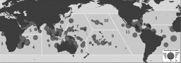 Map of all Chelonias mydas nesting sites indicating delineation of distinct population segments: (1) North Atlantic, (2) Mediterranean, (3) South Atlantic, (4) Southwest Indian, (5) North Indian, (6) East Indian-West Pacific, (7) Central West Pacific, (8) Southwest Pacific, (9) Central South Pacific, (10) Central North Pacific, and (11) East Pacific.
