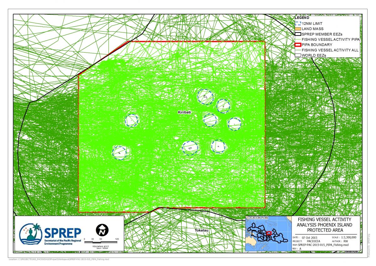 A simple analysis of archived AIS data from Kiribati’s Phoenix Island Protected Area (PIPA; 408,250 km2 or 11% of Kiribati’s EEZ) gauges the amount of fishing vessel traffic traversing across PIPA during April, 2013 – March, 2014, a period before PIPA was closed to all commercial fishing on January 1, 2015. AIS vessel tracks identified as fishing revealed 115 fishing vessels within PIPA traversing the area for a total distance of 523,686 km (Note: AIS vessel tracks obtained from ExactEarth and fishing vessels identified by stated vessel type and combining data with Fisheries Forum Agency fishing vessel databases). Vessel activity was higher within PIPA (1.28 km/km2) than in all three Kiribati EEZs (1.19 km/km2). The analysis also shows the vessels respecting the 12 nautical mile territorial waters around the atolls and islands of Kiribati. This analysis should stimulate the routine use of AIS data to examine fishing activity in PIPA after the 2015 commercial fishing closure to help effectively manage and govern PIPA.