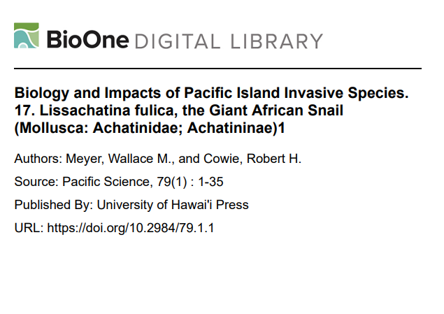 We review the taxonomy, biology, and the ecological, economic, and human health impacts of the giant African snail, Lissachatina fulica, in the Pacific. Invasion of L. fulica in the Pacific has a complex history. Rapid population expansions of L. fulica on Pacific Islands, and elsewhere, in the 1930s and 1940s prompted researchers to explore its biology with a focus on understanding and minimizing its impacts in agricultural systems. Similarly, recent outbreaks of rat lungworm disease have prompted increased research exploring diseases associated with L. fulica and other snail species. Consequently, L. fulica is one of the most studied land snail species in the world, and many aspects of its biology (life-history patterns, temperature and humidity requirements, and infection by parasites and pathogens) are relatively well described. However, the ecological and economic impacts of L. fulica throughout the Pacific remain poorly understood. For example, we still have a rudimentary understanding of its diet and habitat requirements, do not know how L. fulica establishment influences many plant or animal communities and ecosystem functions, and there remain diverse opinions regarding its agricultural impact. The main known ecological impacts of L. fulica are associated with the human response to its invasion, which included ill-conceived biocontrol efforts involving introduction of generalist snail predators that have driven extinctions of a significant proportion of the >6,000 native Pacific island land snail species. We know of no current plans for eradication or large-scale control efforts for L. fulica and other invasive snails/slugs in the Pacific with well-established populations. However, emerging health risks (e.g., rat lungworm disease) and better documentation of impacts may change perceptions enough to create policies aimed at controlling L. fulica and other non-native mollusc species and/or preventing further spread and establishment of new non-native molluscs throughout the Pacific.