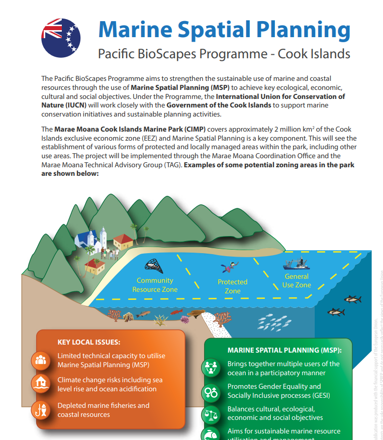 The Pacific BioScapes Programme aims to strengthen the sustainable use of marine and coastal resources through the use of Marine Spatial Planning (MSP) to achieve key ecological, economic, cultural and social objectives. Under the Programme, the International Union for Conservation of Nature (IUCN) will work closely with the Government of the Cook Islands to support marine conservation initiatives and sustainable planning activities.Call Number: [EL]Physical Description: 1 p.