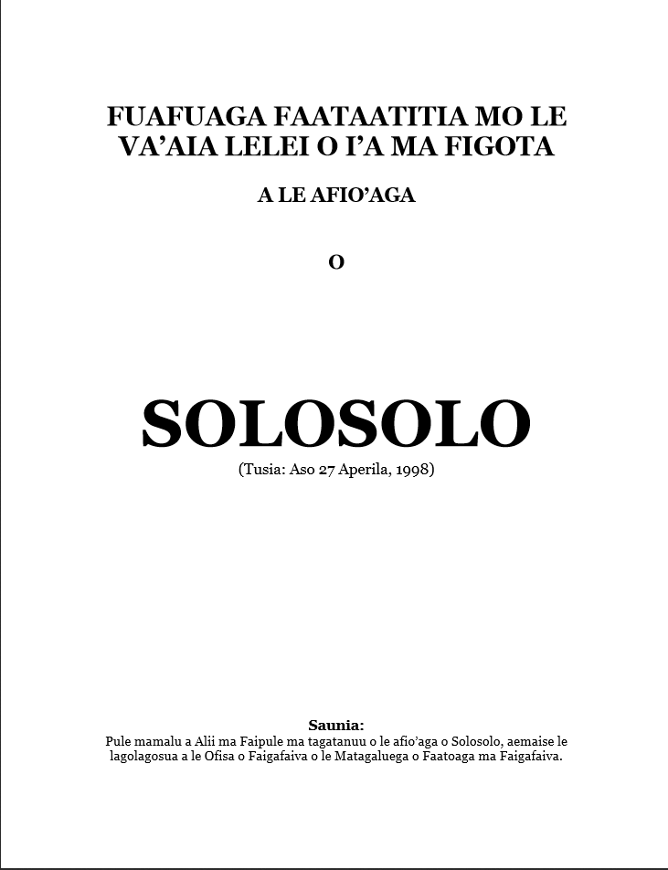 O lenei fuafuaga o le Pulega o le Siosiomagao le Gataifale ma le Va’aia Lelei o I’a ma Figota, na saunia e le itupa o Aumaga, Tina ma Tamaitai, aemaise le Pule mamalu a Alii ma Faipule o le Afioaga o Solosolo, faatasi ai ma le lagolagosua a le Vaega o Faigafaiva,